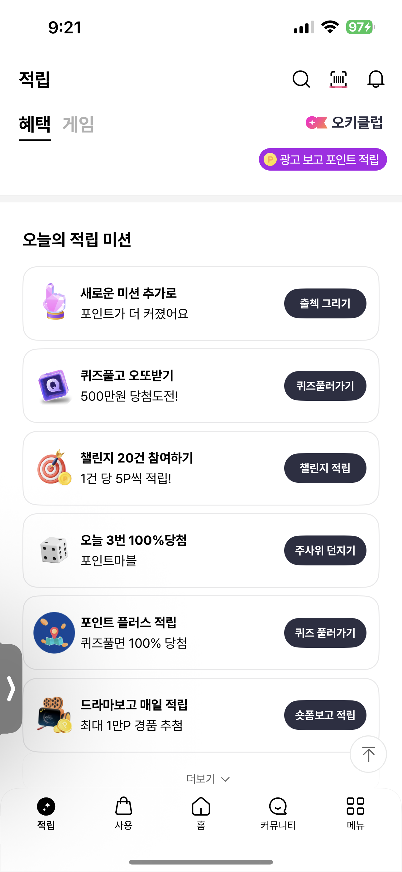 - 오퀴즈 참여: 퀴즈 정답 맞히면 포인트 적립