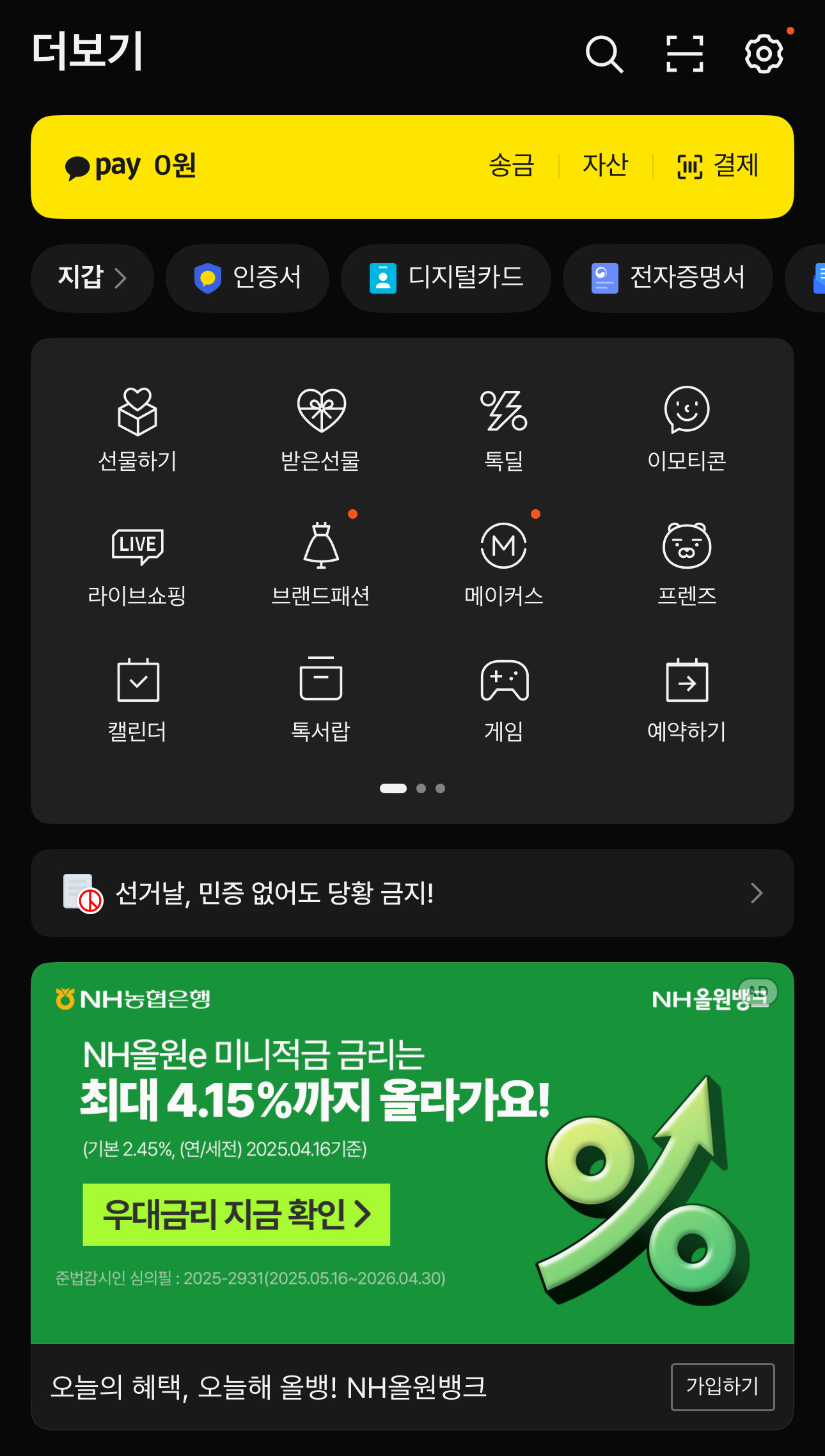 - 카카오톡 → 더보기(⋯) → Pay → 혜택 → 매일 모으는 혜택