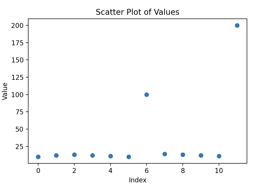 df = pd.DataFrame({'Value': [10, 12, 13, 12, 11, 10, 100, 14, 13, 12, 11, 200]})