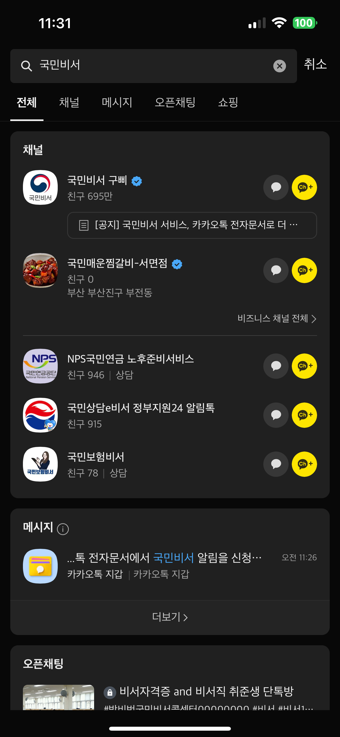 1️⃣ 카카오톡 실행 후 #탭(샾탭) → ‘국민비서’ 검색