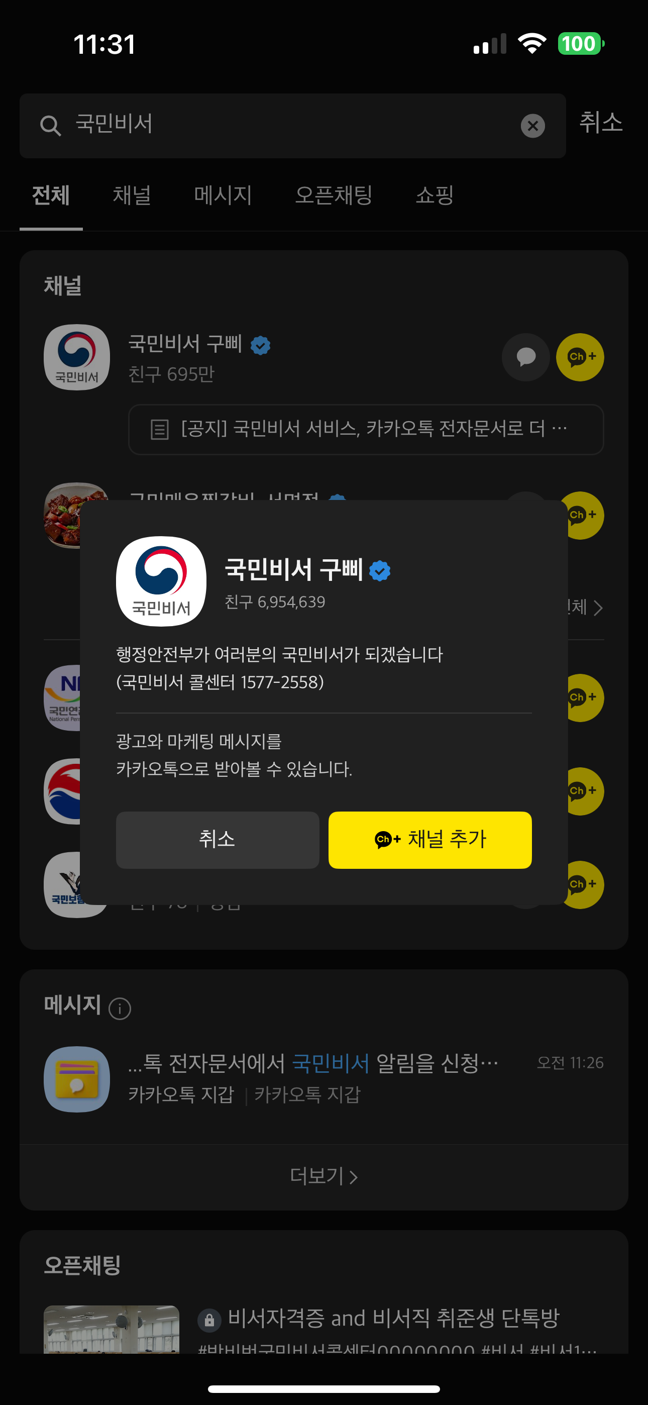 - 채널 목록에서 ‘국민비서 구삐’ 선택 후 [채널 추가]